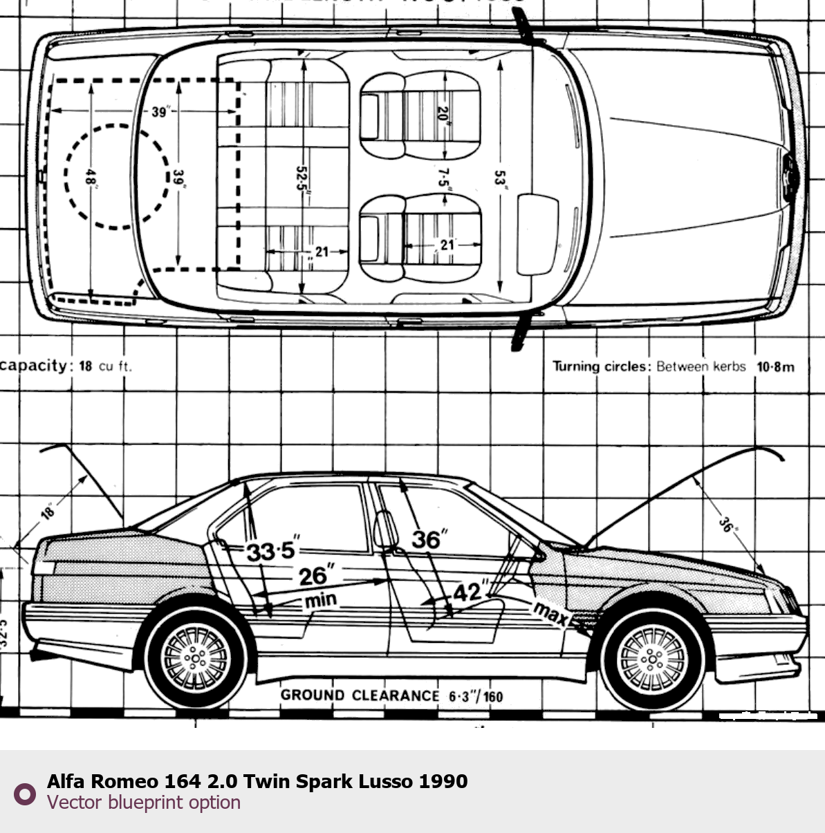 Raster blueprint of the 1990 Alfa Romeo 164 2.0 Twin Spark Lusso Sedan. This free downloadable image can be used for graphic projects, digital design, and 3D modeling. The file provides accurate exterior proportions of the vehicle. Model year: 1990. Body type: Sedan.