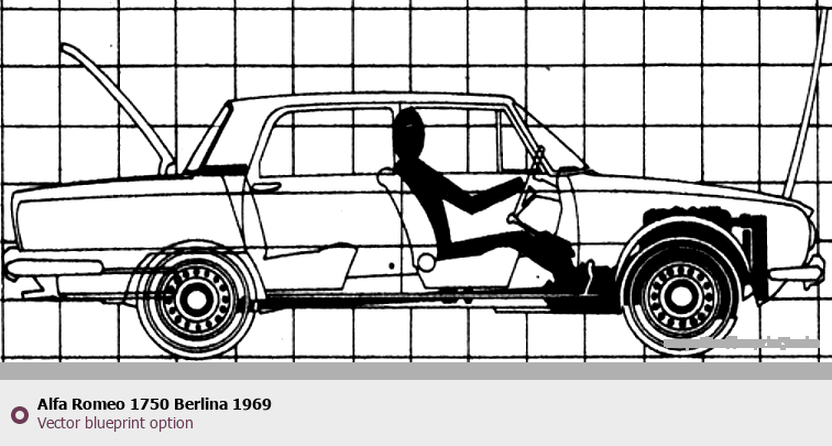 Raster blueprint of the 1969 Alfa Romeo 1750 Berlina Sedan. This free downloadable image can be used for graphic projects, digital design, and 3D modeling. The file provides accurate exterior proportions of the vehicle. Model year: 1969. Body type: Sedan.