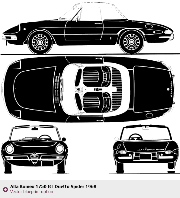 Raster blueprint of the 1968 Alfa Romeo 1750 GT Duetto Spider Roadster. This free downloadable image can be used for graphic projects, digital design, and 3D modeling. The file provides accurate exterior proportions of the vehicle. Model year: 1968. Body type: Roadster.