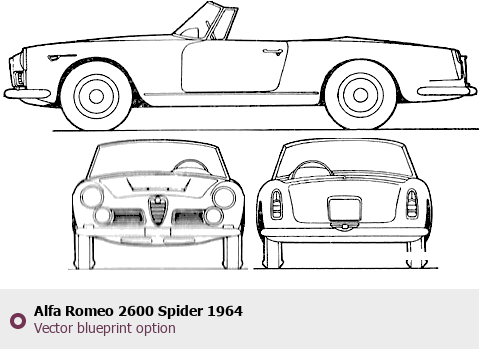Raster blueprint of the 1964 Alfa Romeo 2600 Spider Roadster. This free downloadable image can be used for graphic projects, digital design, and 3D modeling. The file provides accurate exterior proportions of the vehicle. Model year: 1964. Body type: Roadster.
