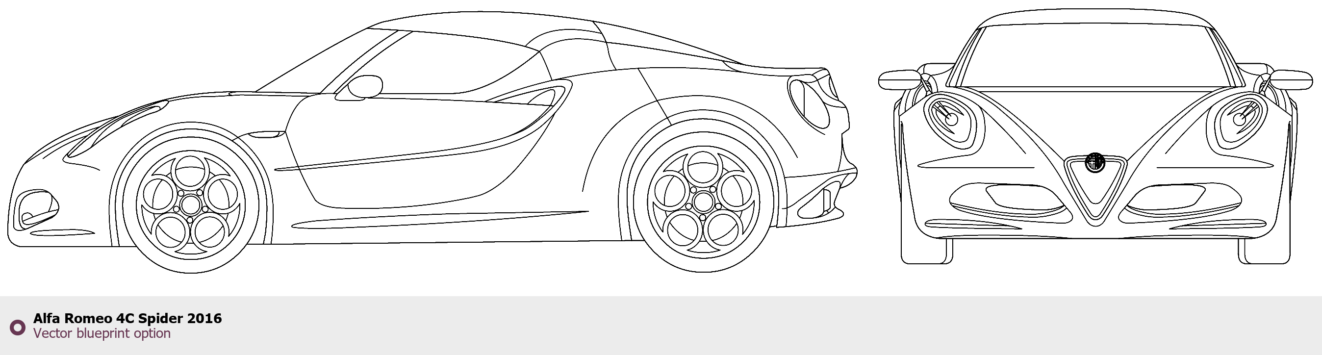 Raster blueprint of the 2016 Alfa Romeo 4C Spider Roadster. This free downloadable image can be used for graphic projects, digital design, and 3D modeling. The file provides accurate exterior proportions of the vehicle. Model year: 2016. Body type: Roadster.