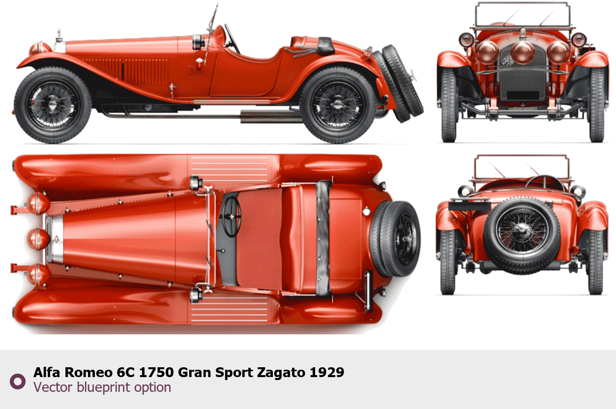Raster blueprint of the 1929 Alfa Romeo 6C 1750 Gran Sport Zagato Cabriolet. This free downloadable image can be used for graphic projects, digital design, and 3D modeling. The file provides accurate exterior proportions of the vehicle. Model year: 1929. Body type: Cabriolet.