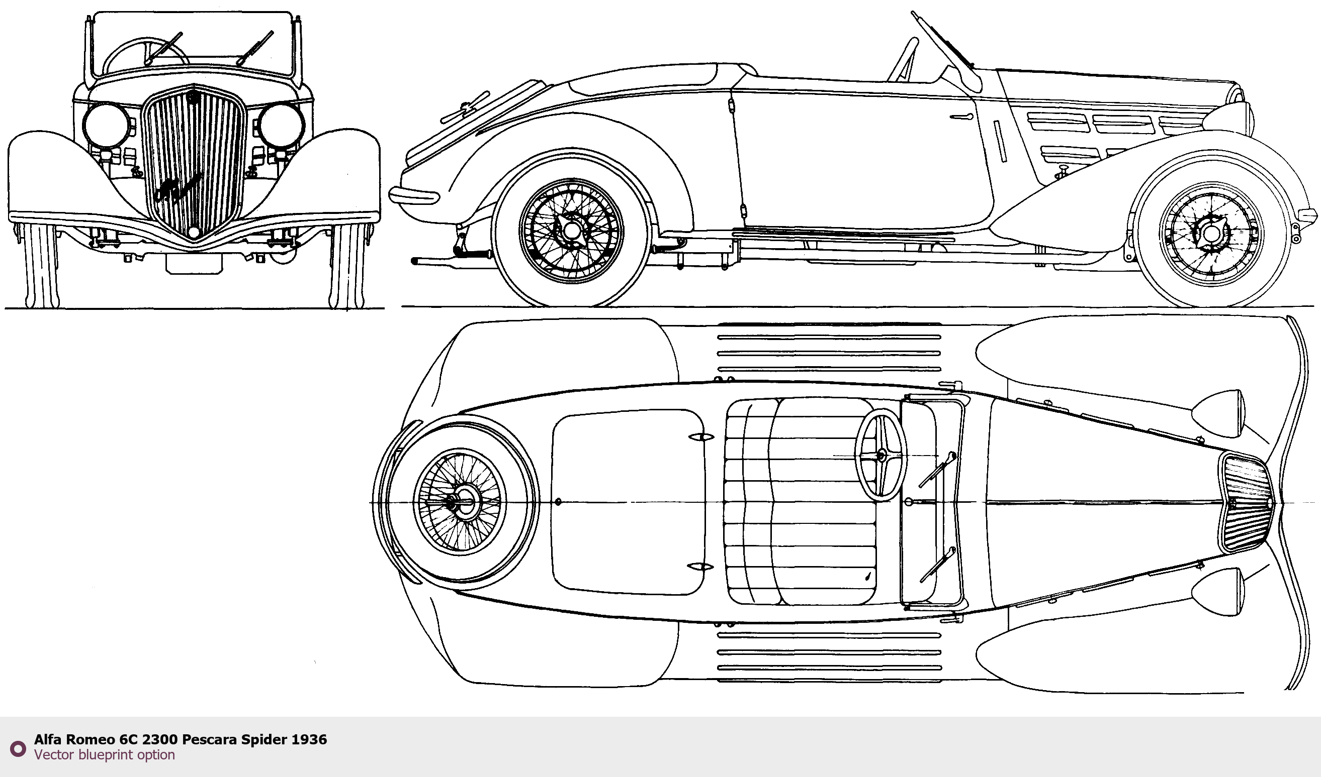 Raster blueprint of the 1936 Alfa Romeo 6C 2300 Pescara Spider Cabriolet. This free downloadable image can be used for graphic projects, digital design, and 3D modeling. The file provides accurate exterior proportions of the vehicle. Model year: 1936. Body type: Cabriolet.
