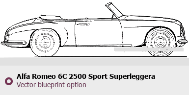 Raster blueprint of the 1951 Alfa Romeo 6C 2500 Sport Superleggera Cabrio Cabriolet. This free downloadable image can be used for graphic projects, digital design, and 3D modeling. The file provides accurate exterior proportions of the vehicle. Model year: 1951. Body type: Cabriolet.
