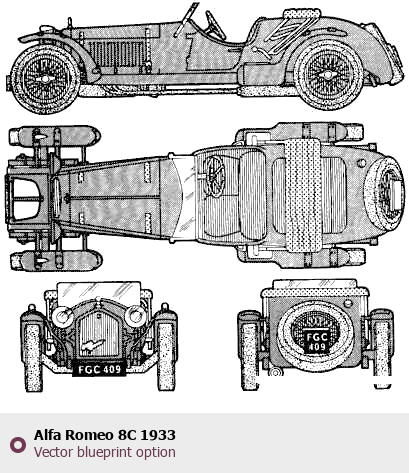 Raster blueprint of the 1933 Alfa Romeo 8C Tag. This free downloadable image can be used for graphic projects, digital design, and 3D modeling. The file provides accurate exterior proportions of the vehicle. Model year: 1933. Body type: Tag.