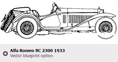 Raster blueprint of the 1933 Alfa Romeo 8C 2300 Tag. This free downloadable image can be used for graphic projects, digital design, and 3D modeling. The file provides accurate exterior proportions of the vehicle. Model year: 1933. Body type: Tag.