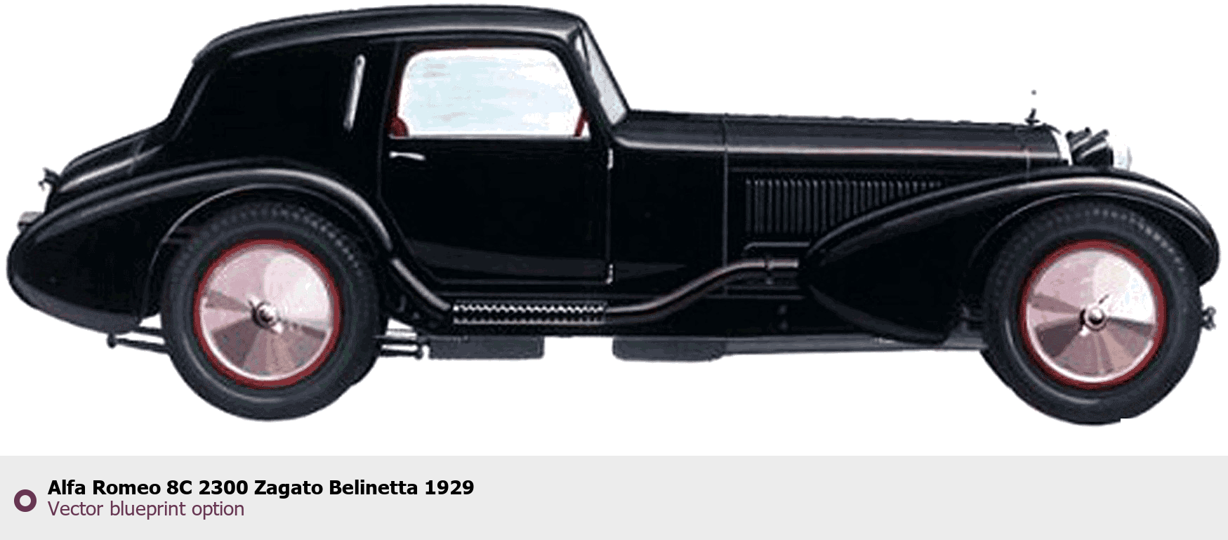 Raster blueprint of the 1929 Alfa Romeo 8C 2300 Zagato Belinetta Tag. This free downloadable image can be used for graphic projects, digital design, and 3D modeling. The file provides accurate exterior proportions of the vehicle. Model year: 1929. Body type: Tag.