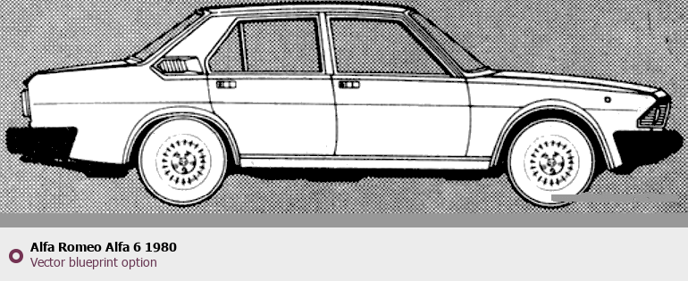 Raster blueprint of the 1980 Alfa Romeo Alfa 6 Tag. This free downloadable image can be used for graphic projects, digital design, and 3D modeling. The file provides accurate exterior proportions of the vehicle. Model year: 1980. Body type: Tag.