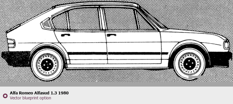 Raster blueprint of the 1980 Alfa Romeo Alfasud 1.3 Tag. This free downloadable image can be used for graphic projects, digital design, and 3D modeling. The file provides accurate exterior proportions of the vehicle. Model year: 1980. Body type: Tag.