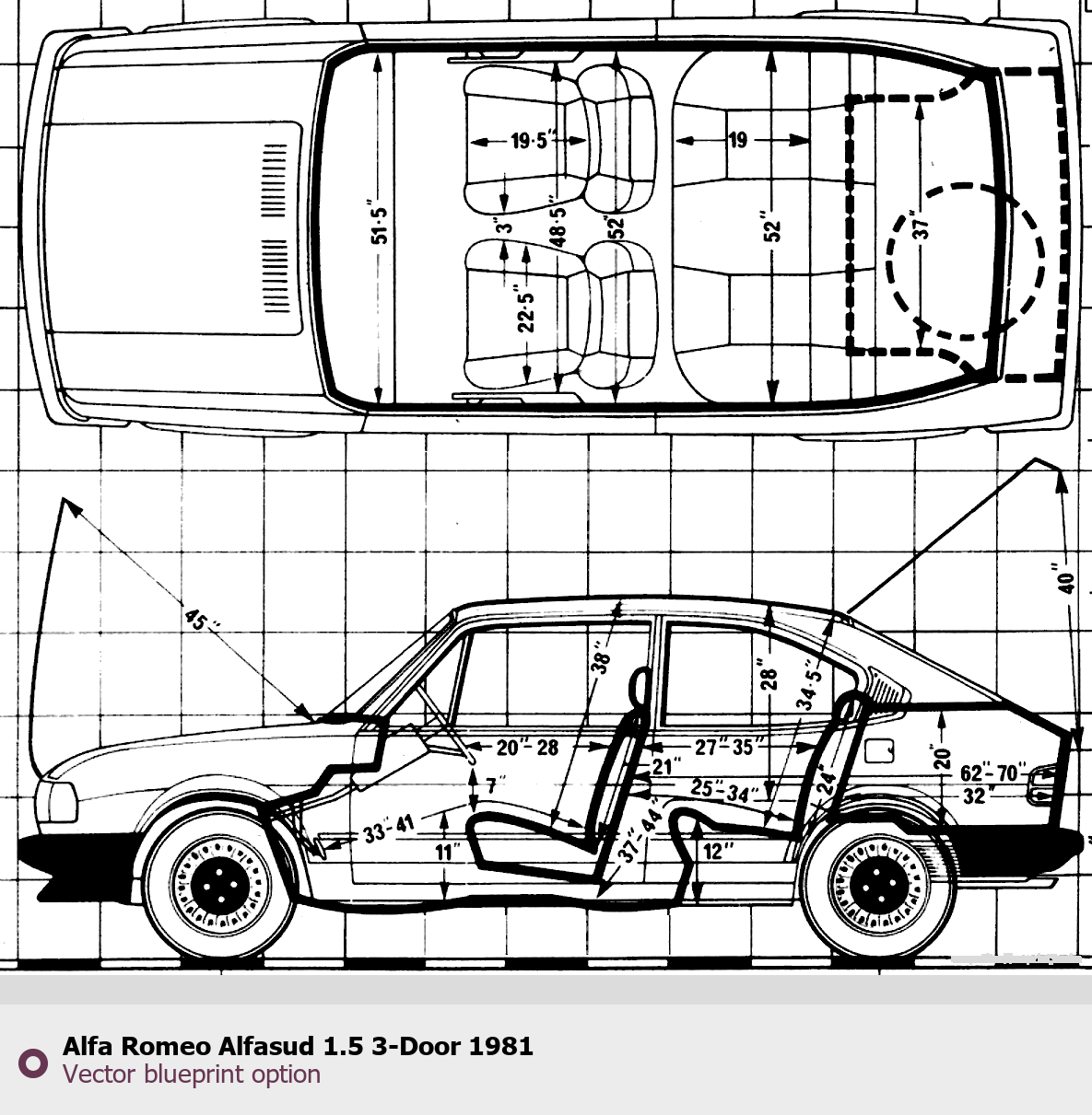 Raster blueprint of the 1981 Alfa Romeo Alfasud 1.5 3-Door Tag. This free downloadable image can be used for graphic projects, digital design, and 3D modeling. The file provides accurate exterior proportions of the vehicle. Model year: 1981. Body type: Tag.