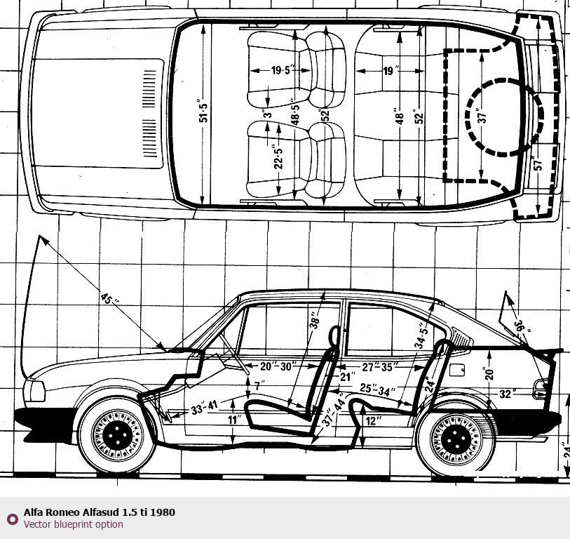Raster blueprint of the 1980 Alfa Romeo Alfasud 1.5 ti Tag. This free downloadable image can be used for graphic projects, digital design, and 3D modeling. The file provides accurate exterior proportions of the vehicle. Model year: 1980. Body type: Tag.