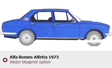 Raster blueprint of the 1975 Alfa Romeo Alfetta Sedan. This free downloadable image can be used for graphic projects, digital design, and 3D modeling. The file provides accurate exterior proportions of the vehicle. Model year: 1975. Body type: Sedan.