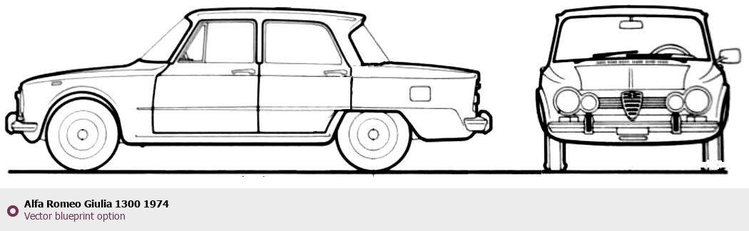 Raster blueprint of the 1974 Alfa Romeo Giulia 1300 Sedan. This free downloadable image can be used for graphic projects, digital design, and 3D modeling. The file provides accurate exterior proportions of the vehicle. Model year: 1974. Body type: Sedan.