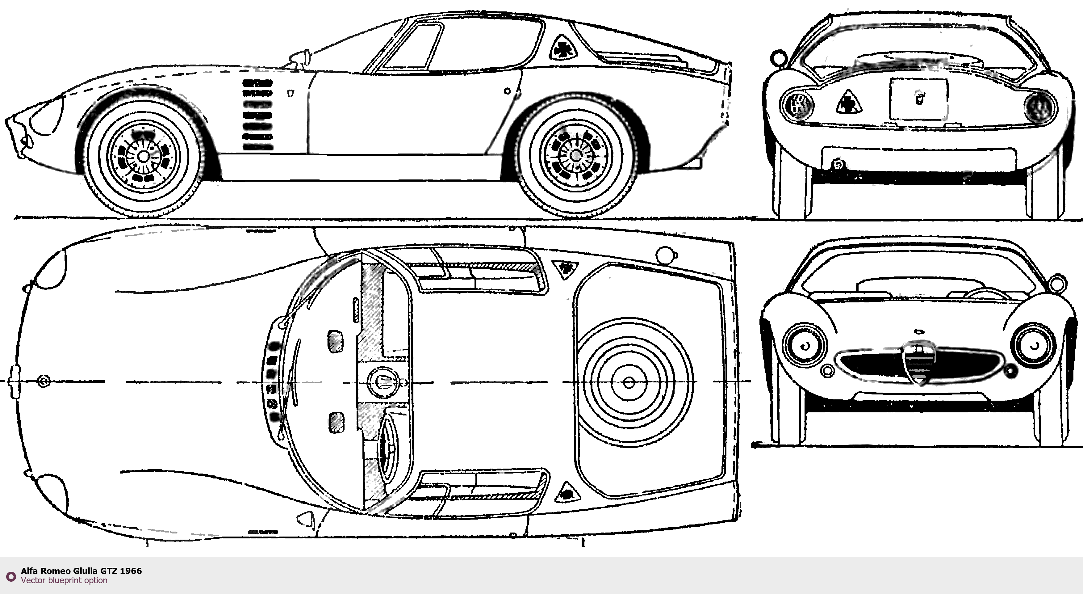 Raster blueprint of the 1966 Alfa Romeo Giulia GTZ Sedan. This free downloadable image can be used for graphic projects, digital design, and 3D modeling. The file provides accurate exterior proportions of the vehicle. Model year: 1966. Body type: Sedan.