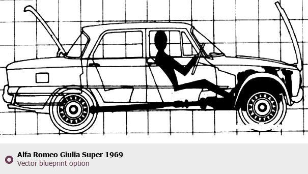 Raster blueprint of the 1969 Alfa Romeo Giulia Super Sedan. This free downloadable image can be used for graphic projects, digital design, and 3D modeling. The file provides accurate exterior proportions of the vehicle. Model year: 1969. Body type: Sedan.