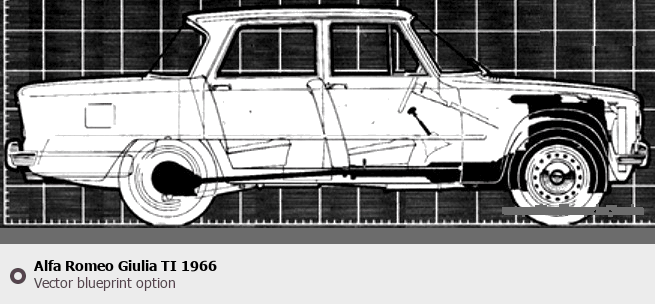 Raster blueprint of the 1966 Alfa Romeo Giulia TI Sedan. This free downloadable image can be used for graphic projects, digital design, and 3D modeling. The file provides accurate exterior proportions of the vehicle. Model year: 1966. Body type: Sedan.