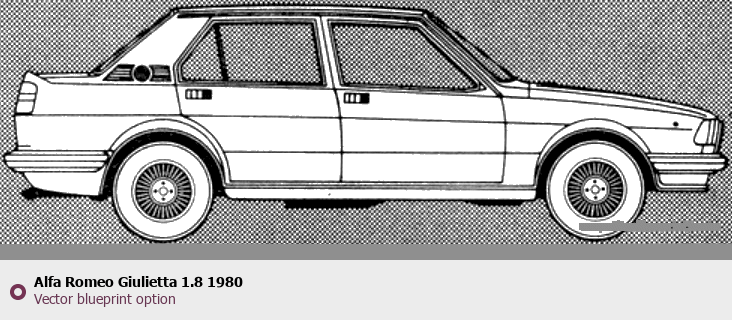 Raster blueprint of the 1980 Alfa Romeo Giulietta 1.8 Tag. This free downloadable image can be used for graphic projects, digital design, and 3D modeling. The file provides accurate exterior proportions of the vehicle. Model year: 1980. Body type: Tag.