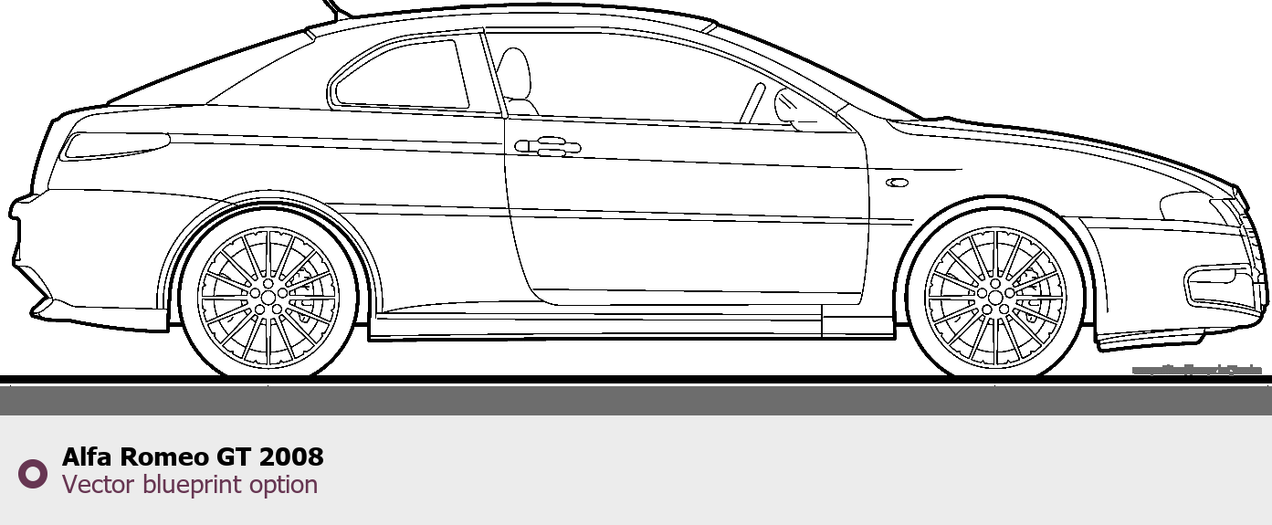 Raster blueprint of the 2008 Alfa Romeo GT Coupe. This free downloadable image can be used for graphic projects, digital design, and 3D modeling. The file provides accurate exterior proportions of the vehicle. Model year: 2008. Body type: Coupe.