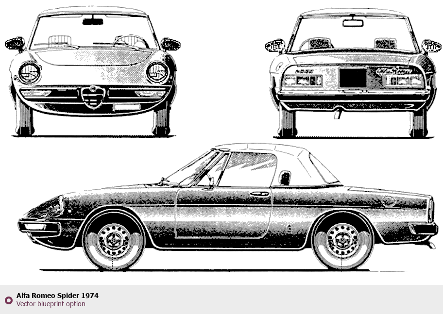 Raster blueprint of the 1974 Alfa Romeo Spider Roadster. This free downloadable image can be used for graphic projects, digital design, and 3D modeling. The file provides accurate exterior proportions of the vehicle. Model year: 1974. Body type: Roadster.