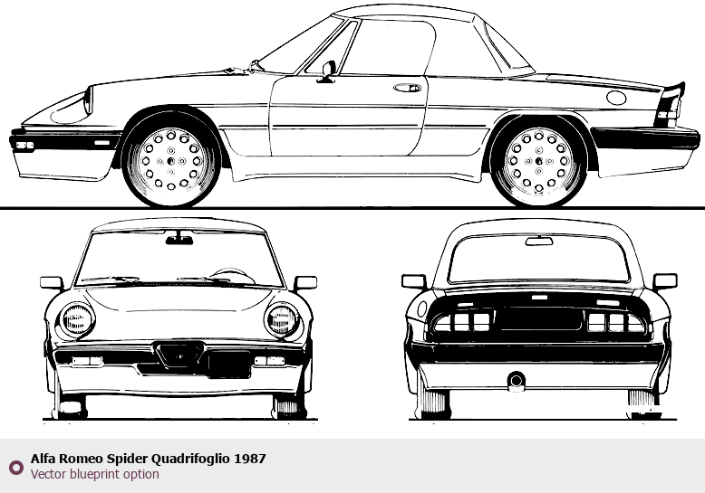 Raster blueprint of the 1987 Alfa Romeo Spider Quadrifoglio Roadster. This free downloadable image can be used for graphic projects, digital design, and 3D modeling. The file provides accurate exterior proportions of the vehicle. Model year: 1987. Body type: Roadster.
