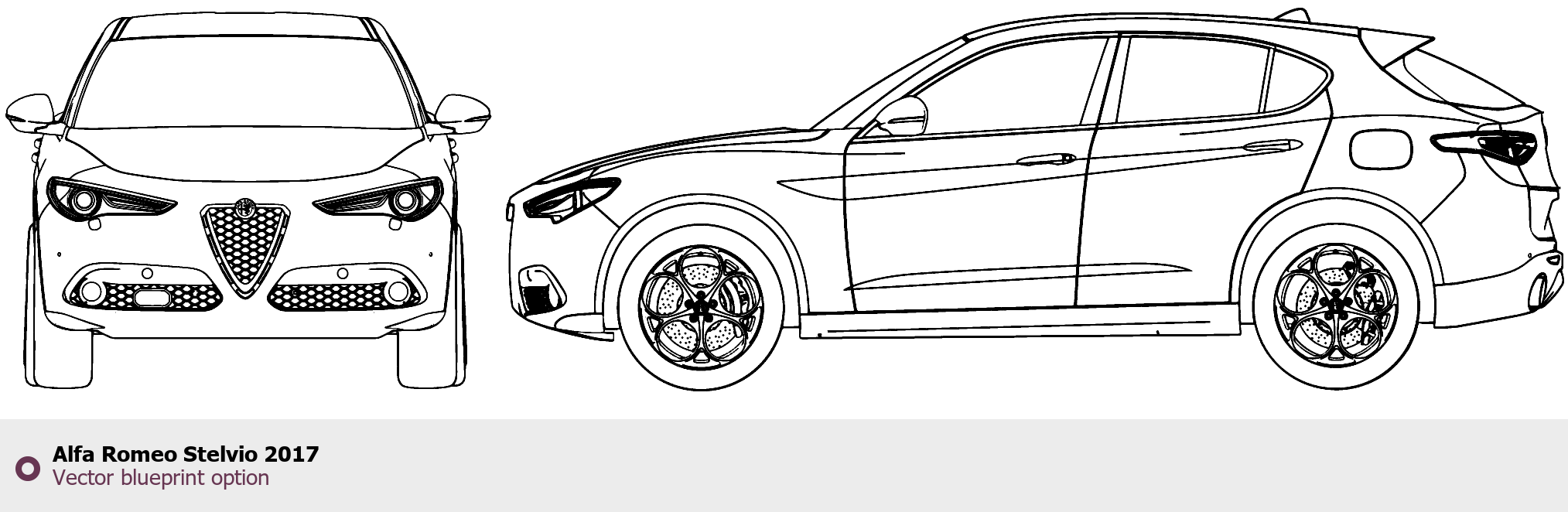 Raster blueprint of the 2017 Alfa Romeo Stelvio SUV. This free downloadable image can be used for graphic projects, digital design, and 3D modeling. The file provides accurate exterior proportions of the vehicle. Model year: 2017. Body type: SUV.