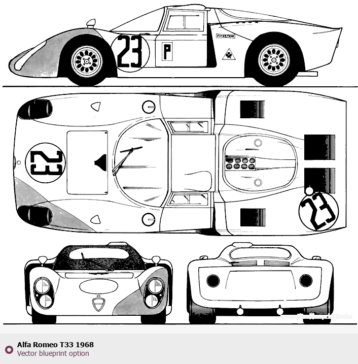Raster blueprint of the 1968 Alfa Romeo T33 Tag. This free downloadable image can be used for graphic projects, digital design, and 3D modeling. The file provides accurate exterior proportions of the vehicle. Model year: 1968. Body type: Tag.