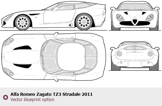 Raster blueprint of the 2011 Alfa Romeo Zagato TZ3 Stradale Coupe. This free downloadable image can be used for graphic projects, digital design, and 3D modeling. The file provides accurate exterior proportions of the vehicle. Model year: 2011. Body type: Coupe.