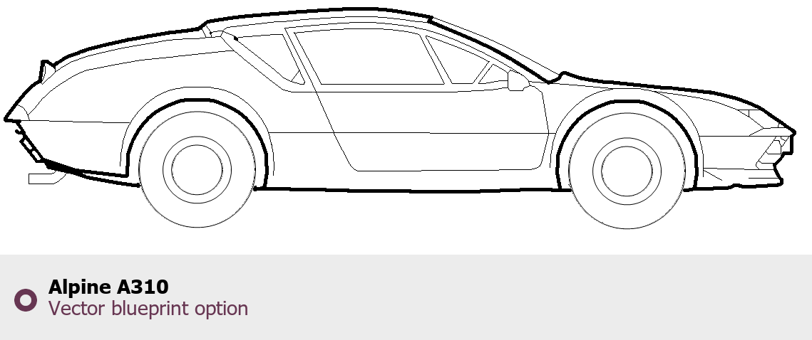 Raster blueprint of the Alpine A310 Tag. This free downloadable image can be used for graphic projects, digital design, and 3D modeling. The file provides accurate exterior proportions of the vehicle. Body type: Tag.