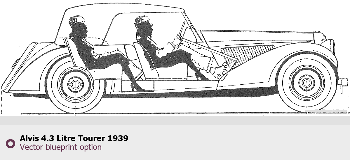 Raster blueprint of the 1939 Alvis 4.3 Litre Tourer Tag. This free downloadable image can be used for graphic projects, digital design, and 3D modeling. The file provides accurate exterior proportions of the vehicle. Model year: 1939. Body type: Tag.