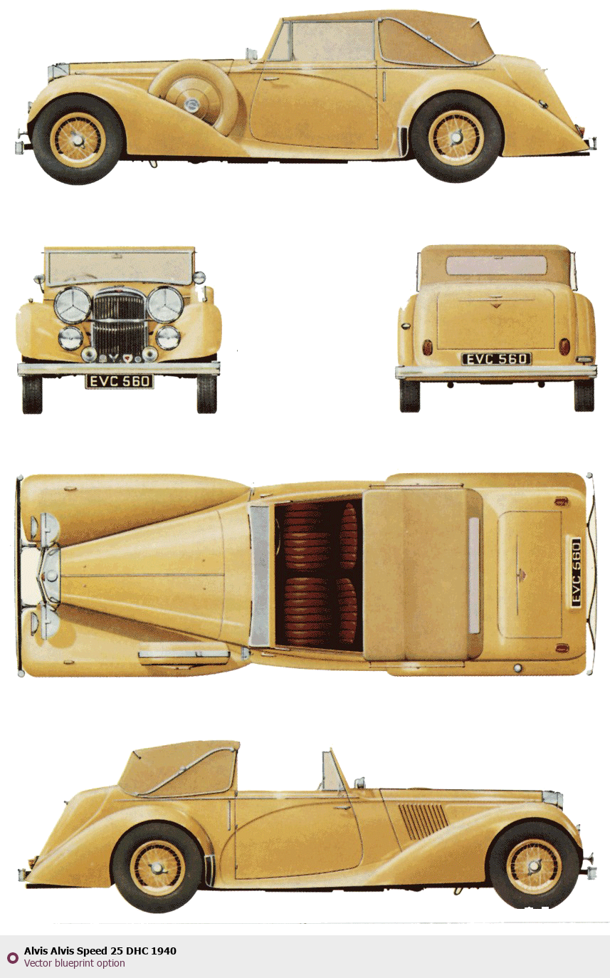 Raster blueprint of the 1940 Alvis Alvis Speed 25 DHC Tag. This free downloadable image can be used for graphic projects, digital design, and 3D modeling. The file provides accurate exterior proportions of the vehicle. Model year: 1940. Body type: Tag.