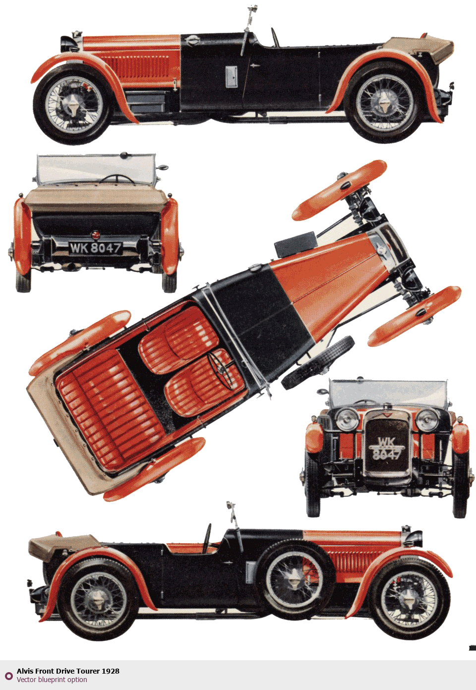 Raster blueprint of the 1928 Alvis Front Drive Tourer Tag. This free downloadable image can be used for graphic projects, digital design, and 3D modeling. The file provides accurate exterior proportions of the vehicle. Model year: 1928. Body type: Tag.