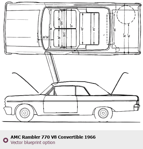 Raster blueprint of the 1966 AMC Rambler 770 V8 Convertible Cabriolet. This free downloadable image can be used for graphic projects, digital design, and 3D modeling. The file provides accurate exterior proportions of the vehicle. Model year: 1966. Body type: Cabriolet.