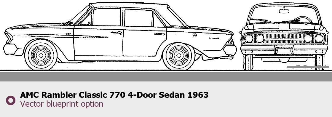 Raster blueprint of the 1963 AMC Rambler Classic 770 4-Door Sedan Sedan. This free downloadable image can be used for graphic projects, digital design, and 3D modeling. The file provides accurate exterior proportions of the vehicle. Model year: 1963. Body type: Sedan.