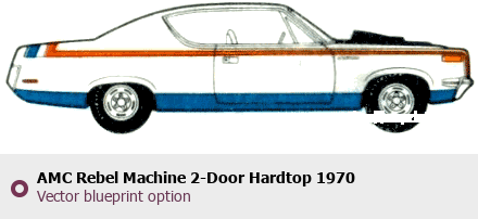 Raster blueprint of the 1970 AMC Rebel Machine 2-Door Hardtop Coupe. This free downloadable image can be used for graphic projects, digital design, and 3D modeling. The file provides accurate exterior proportions of the vehicle. Model year: 1970. Body type: Coupe.