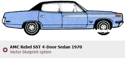 Raster blueprint of the 1970 AMC Rebel SST 4-Door Sedan Coupe. This free downloadable image can be used for graphic projects, digital design, and 3D modeling. The file provides accurate exterior proportions of the vehicle. Model year: 1970. Body type: Coupe.