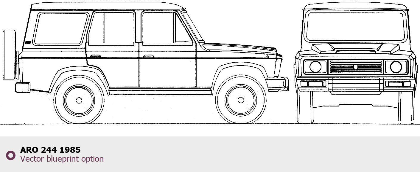 Raster blueprint of the 1985 ARO 244 Tag. This free downloadable image can be used for graphic projects, digital design, and 3D modeling. The file provides accurate exterior proportions of the vehicle. Model year: 1985. Body type: Tag.