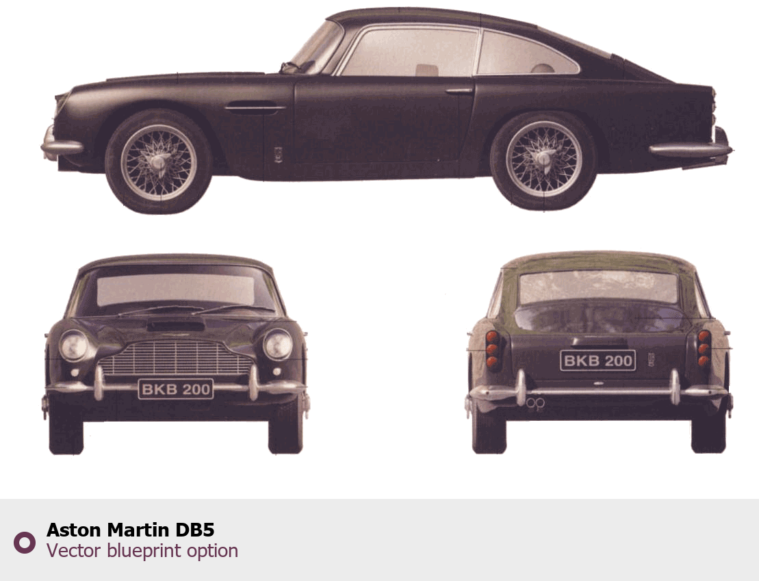 Raster blueprint of the Aston Martin DB5 Tag. This free downloadable image can be used for graphic projects, digital design, and 3D modeling. The file provides accurate exterior proportions of the vehicle. Body type: Tag.