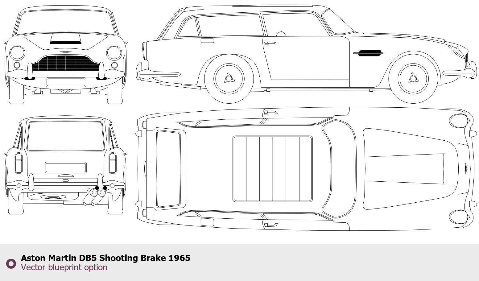 Raster blueprint of the 1965 Aston Martin DB5 Shooting Brake Tag. This free downloadable image can be used for graphic projects, digital design, and 3D modeling. The file provides accurate exterior proportions of the vehicle. Model year: 1965. Body type: Tag.