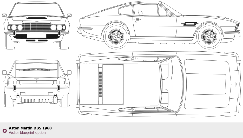Raster blueprint of the 1968 Aston Martin DBS Tag. This free downloadable image can be used for graphic projects, digital design, and 3D modeling. The file provides accurate exterior proportions of the vehicle. Model year: 1968. Body type: Tag.