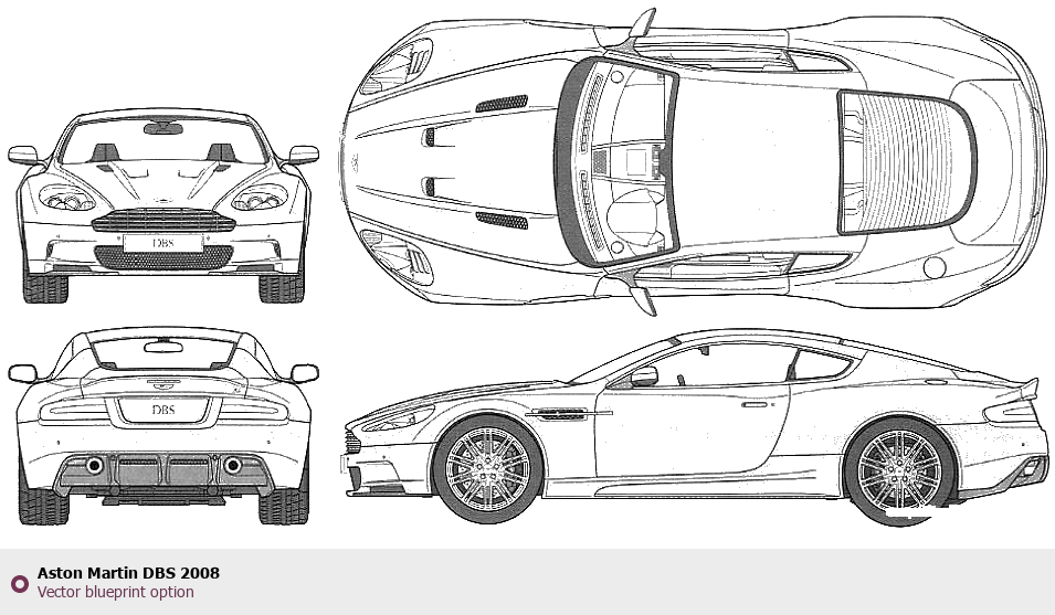 Raster blueprint of the 2008 Aston Martin DBS Tag. This free downloadable image can be used for graphic projects, digital design, and 3D modeling. The file provides accurate exterior proportions of the vehicle. Model year: 2008. Body type: Tag.
