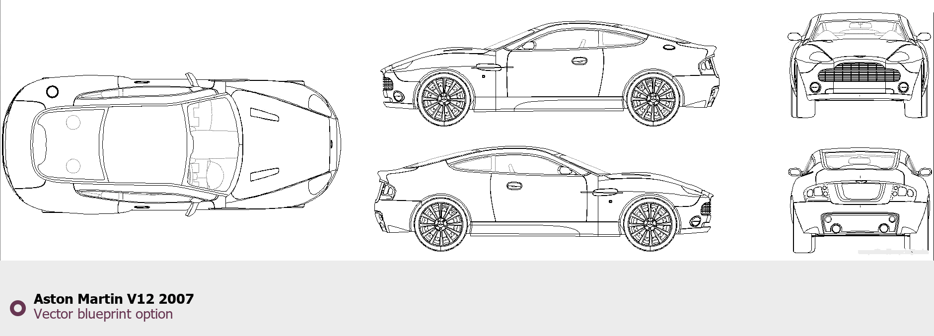 Raster blueprint of the 2007 Aston Martin V12 Tag. This free downloadable image can be used for graphic projects, digital design, and 3D modeling. The file provides accurate exterior proportions of the vehicle. Model year: 2007. Body type: Tag.