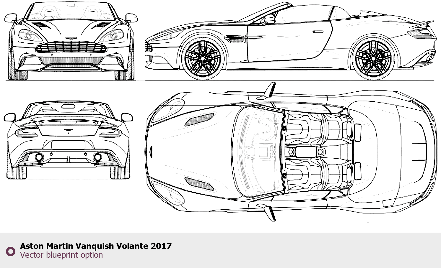 Raster blueprint of the 2017 Aston Martin Vanquish Volante Coupe. This free downloadable image can be used for graphic projects, digital design, and 3D modeling. The file provides accurate exterior proportions of the vehicle. Model year: 2017. Body type: Coupe.