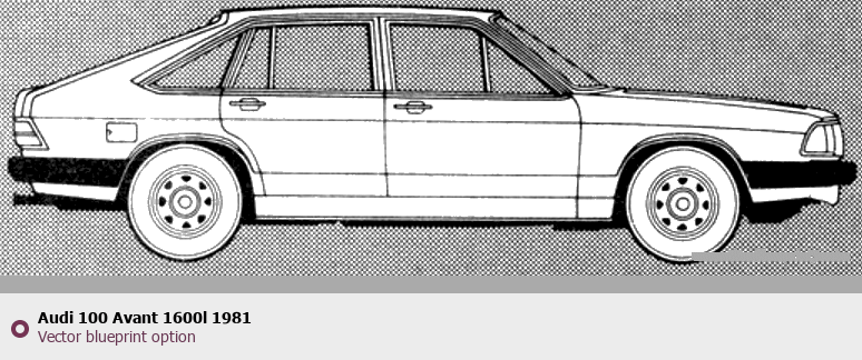 Raster blueprint of the 1981 Audi 100 Avant 1600l Tag. This free downloadable image can be used for graphic projects, digital design, and 3D modeling. The file provides accurate exterior proportions of the vehicle. Model year: 1981. Body type: Tag.