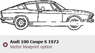 Raster blueprint of the 1972 Audi 100 Coupe S Coupe. This free downloadable image can be used for graphic projects, digital design, and 3D modeling. The file provides accurate exterior proportions of the vehicle. Model year: 1972. Body type: Coupe.