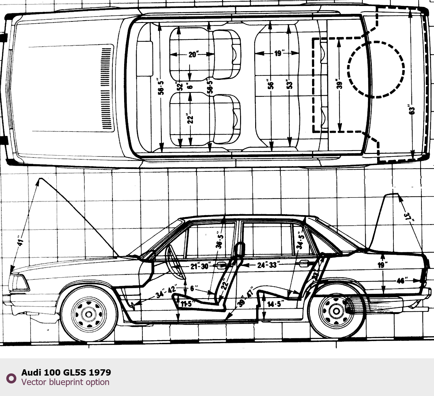 Raster blueprint of the 1979 Audi 100 GL5S Tag. This free downloadable image can be used for graphic projects, digital design, and 3D modeling. The file provides accurate exterior proportions of the vehicle. Model year: 1979. Body type: Tag.
