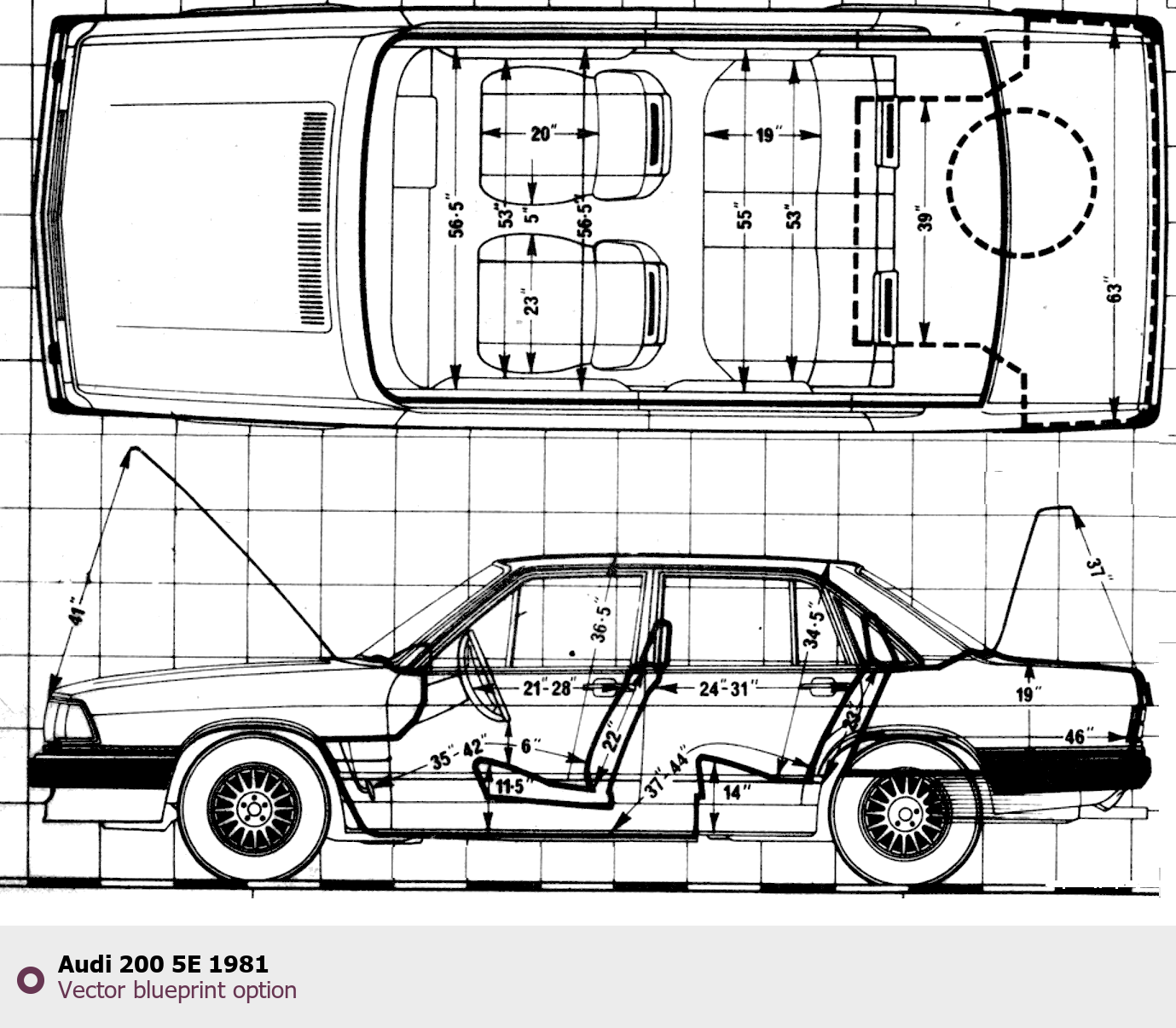 Raster blueprint of the 1981 Audi 200 5E Tag. This free downloadable image can be used for graphic projects, digital design, and 3D modeling. The file provides accurate exterior proportions of the vehicle. Model year: 1981. Body type: Tag.