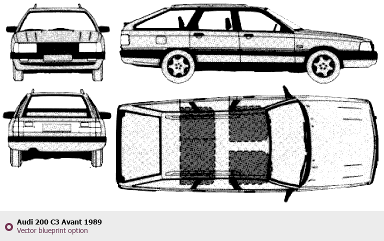Raster blueprint of the 1989 Audi 200 C3 Avant Tag. This free downloadable image can be used for graphic projects, digital design, and 3D modeling. The file provides accurate exterior proportions of the vehicle. Model year: 1989. Body type: Tag.