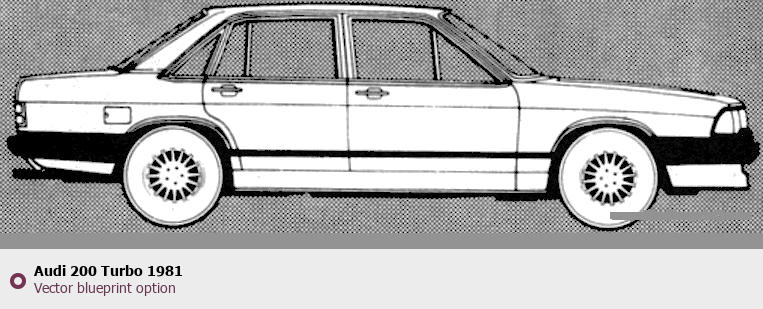 Raster blueprint of the 1981 Audi 200 Turbo Tag. This free downloadable image can be used for graphic projects, digital design, and 3D modeling. The file provides accurate exterior proportions of the vehicle. Model year: 1981. Body type: Tag.