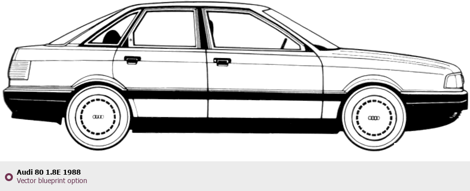 Raster blueprint of the 1988 Audi 80 1.8E Tag. This free downloadable image can be used for graphic projects, digital design, and 3D modeling. The file provides accurate exterior proportions of the vehicle. Model year: 1988. Body type: Tag.