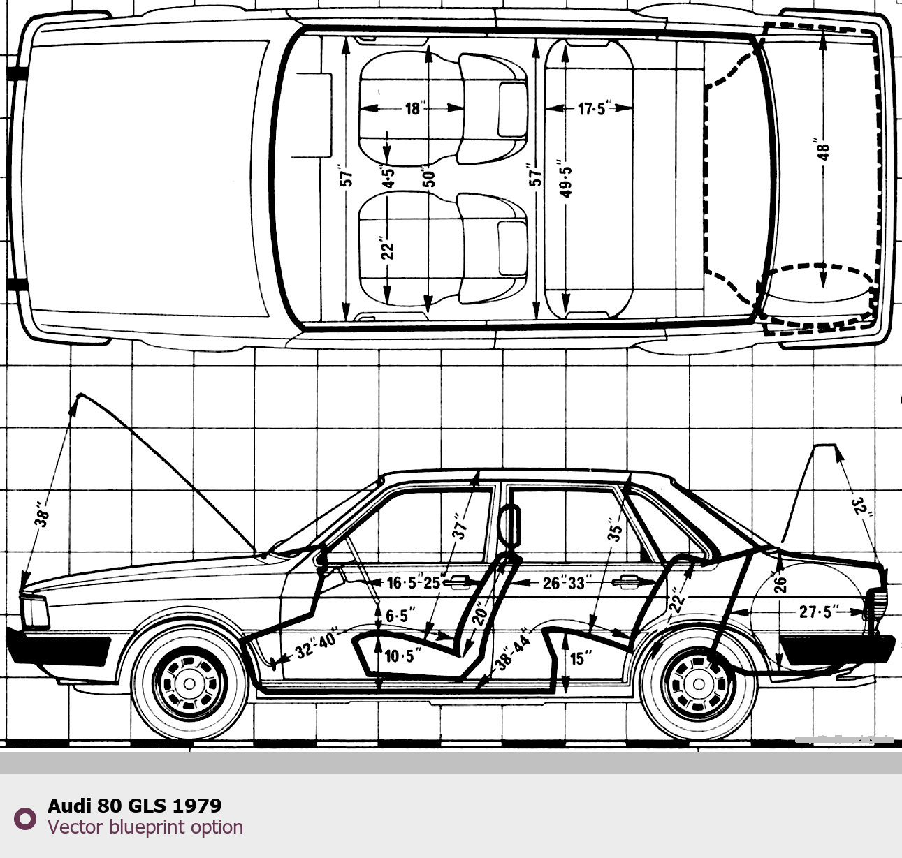 Raster blueprint of the 1979 Audi 80 GLS Tag. This free downloadable image can be used for graphic projects, digital design, and 3D modeling. The file provides accurate exterior proportions of the vehicle. Model year: 1979. Body type: Tag.